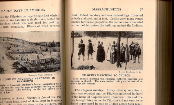 In preparation for Thanksgiving, I consulted my father’s 1945 American History book looking for a hilariously out-moded take on Pilgrims and the red savages who brought them turkey. Unfortunately, I found only bland little USA Today-type event summaries, none of which were the least bit amusing. Simply boring.
