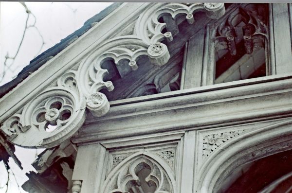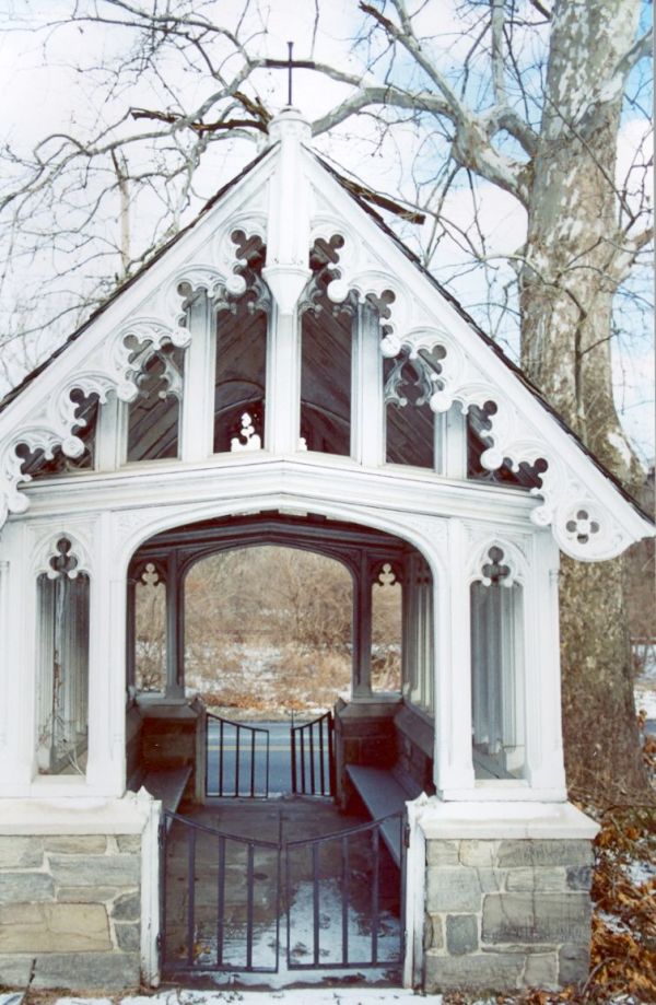 This is a detail of a small Gothic Revival structure built on the grounds of Old Swedes or Christ Church, located in Bridgeport, Pennsylvania.