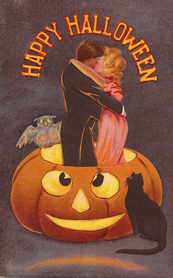 This card was mailed in 1908. I find the couple in a clinch a bit surprising as I don’t think of Halloween as a time for romance, but perhaps the blonde was so startled by a lurking shadow that she simply leapt into the fellow’s arms — and a kiss ensued. (Or perhaps she cleverly lured the fellow to the pumpkin patch and then invented a lurking shadow.)