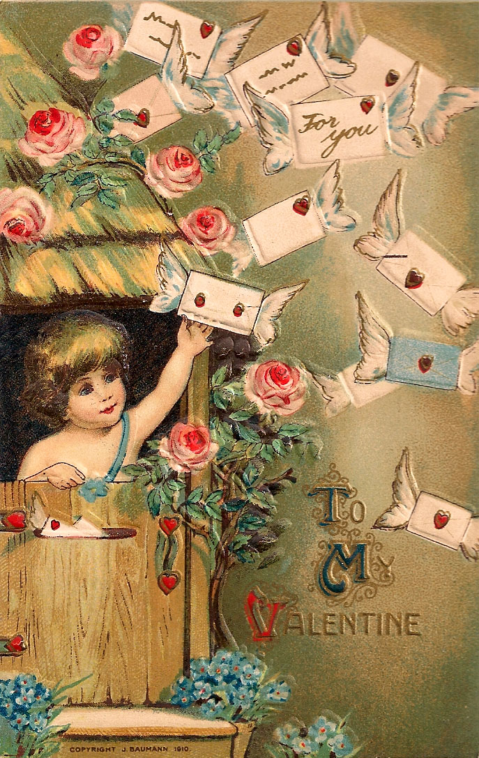 Of the many choices in the scrapbook of my grandfather’s postcards, I chose this one because those little flying valentines seemed like a 1910 foreshadowing of emails. You write your love, sign it with a kiss, and release it to fly through space and land in your lover’s lap.